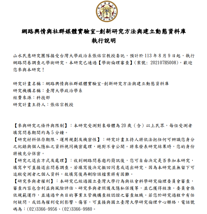 • 時(shí)事議題—新聞時(shí)事議題、兩岸議題等調(diào)查。